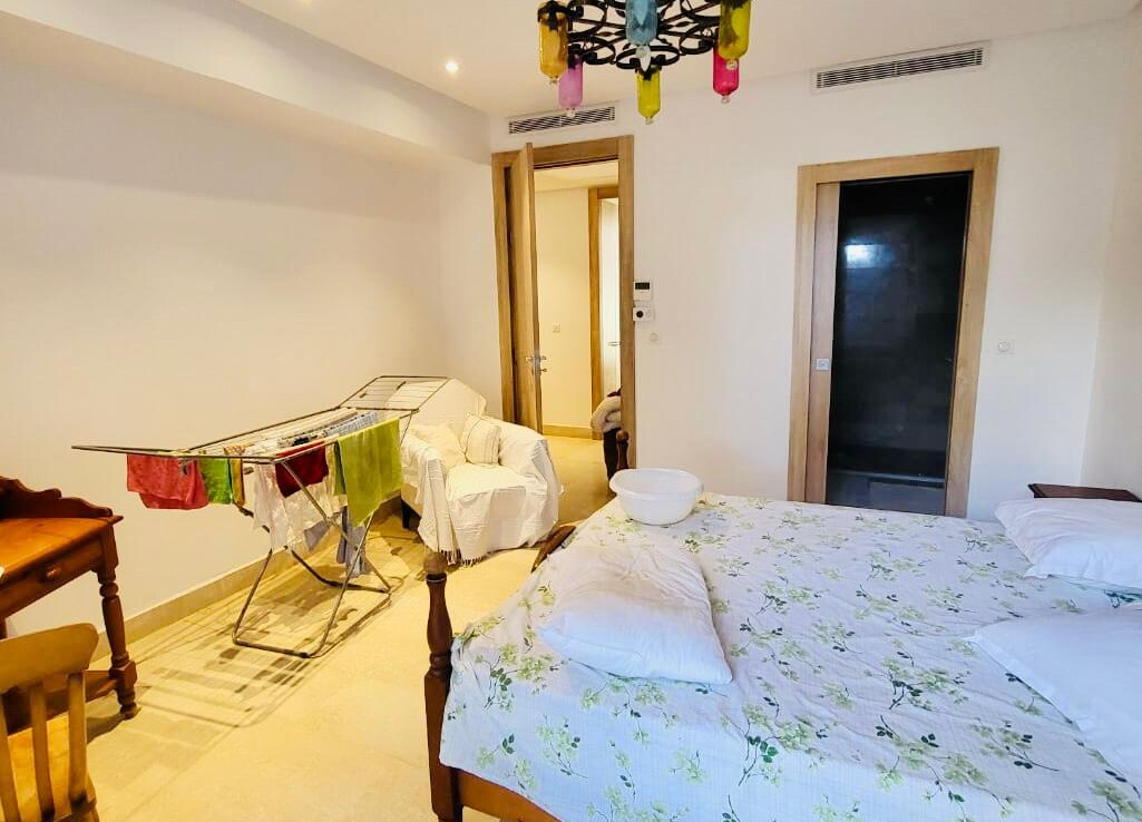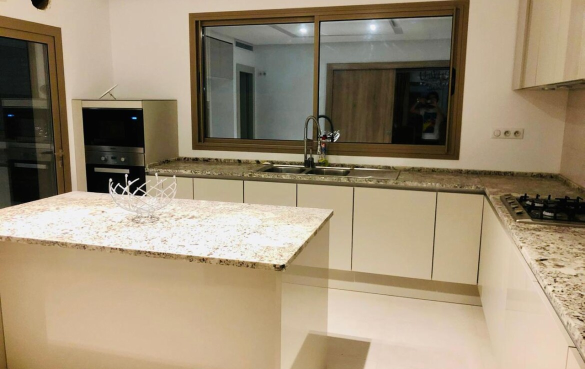 GAMMARTH : A Vendre un très bel Appartement S+3 d’environ 220 m2 couverts composé d’un Hall d’entrée, Salon – Salle à manger qui donne sur un grand Jardin d’environ 190 m2, Cuisine équipée avec économat et séchoir, Sde invités.