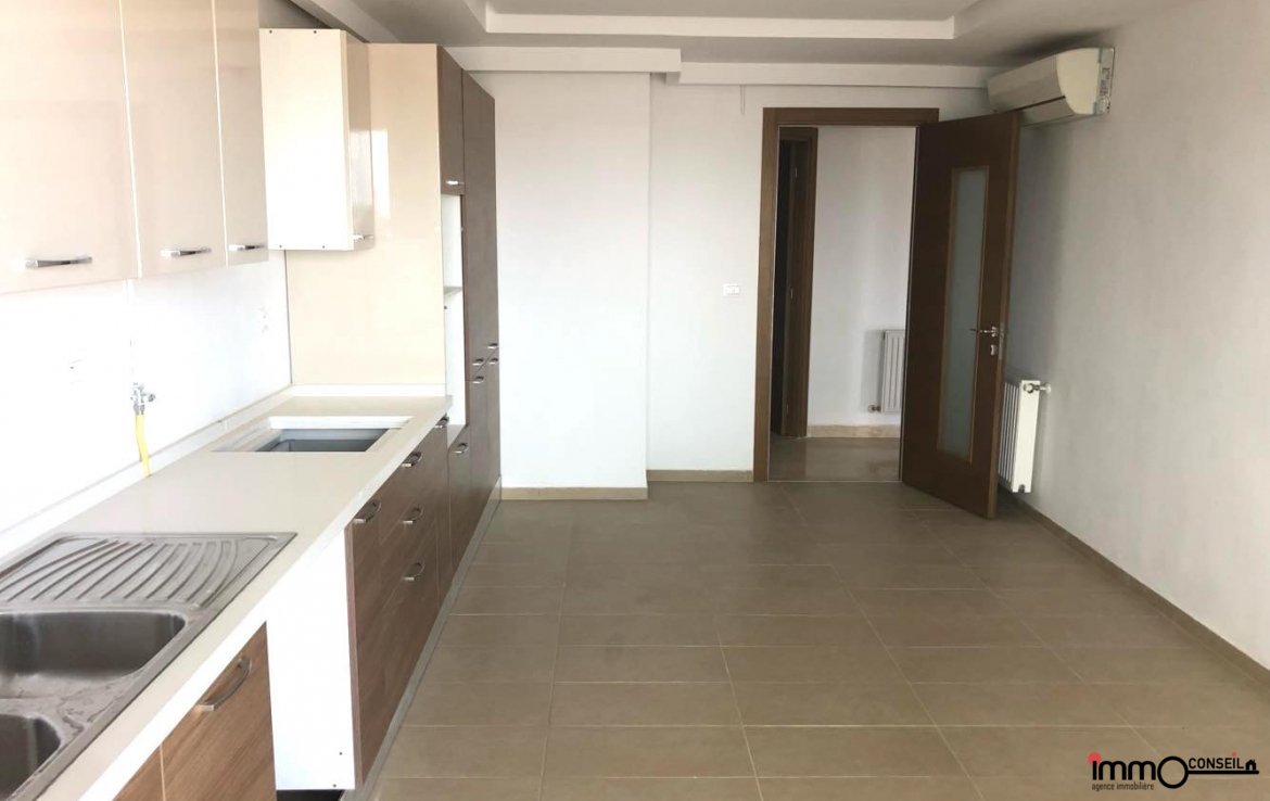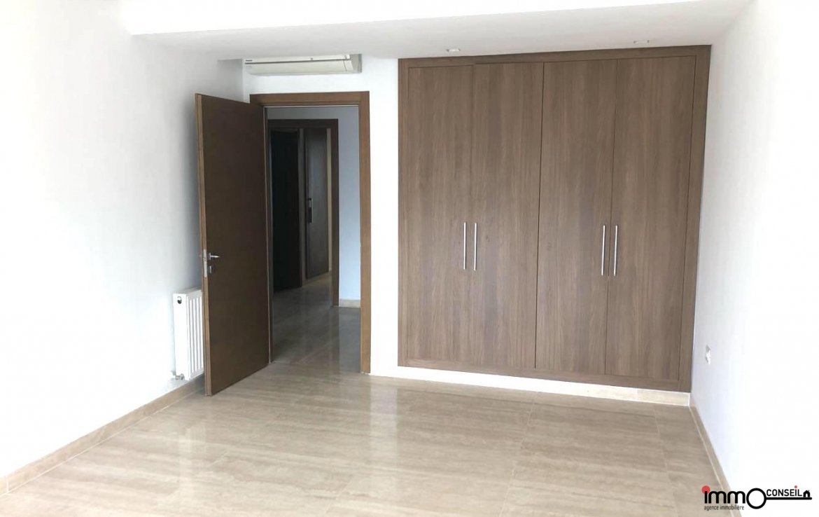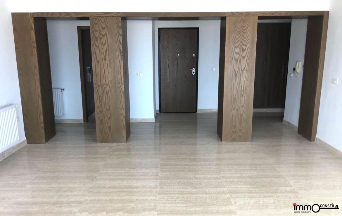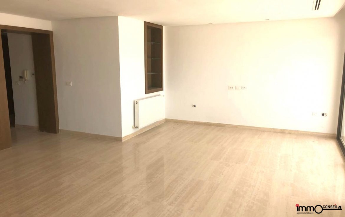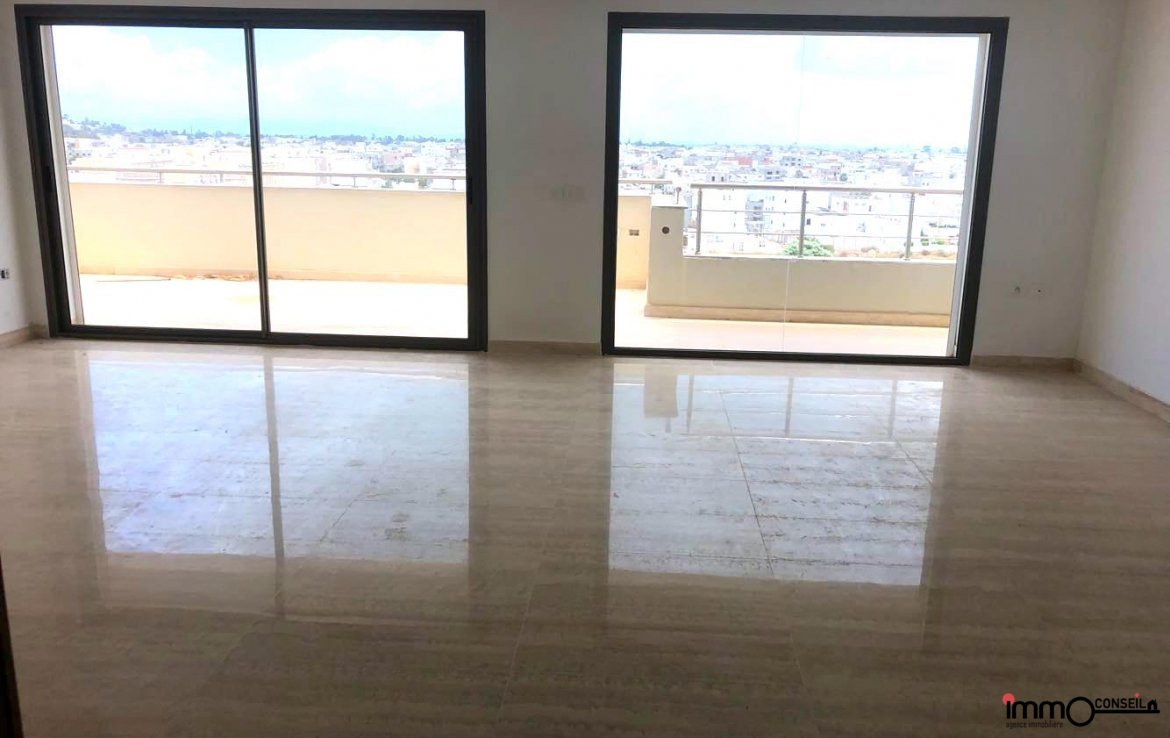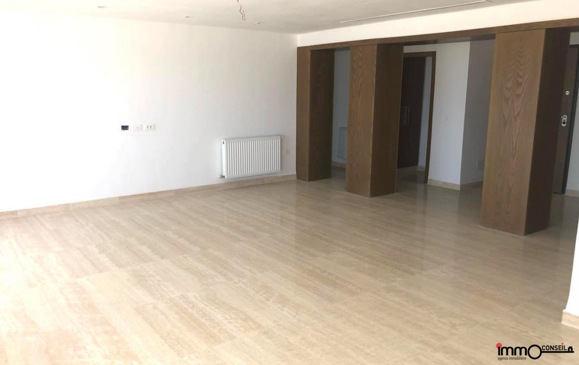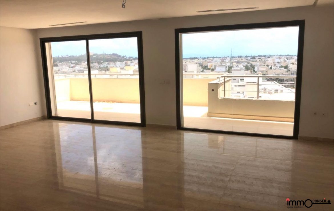 JARDINS DE CARTHAGE : A Vendre un très bel Appartement S+3 Neuf d’environ 250 m2 couverts, composé d’un Grand Salon – Salle à manger, d’une Cuisine équipée, d’une Chambre de Service, D’une Suite Parentale et de 2 Chambres à coucher.