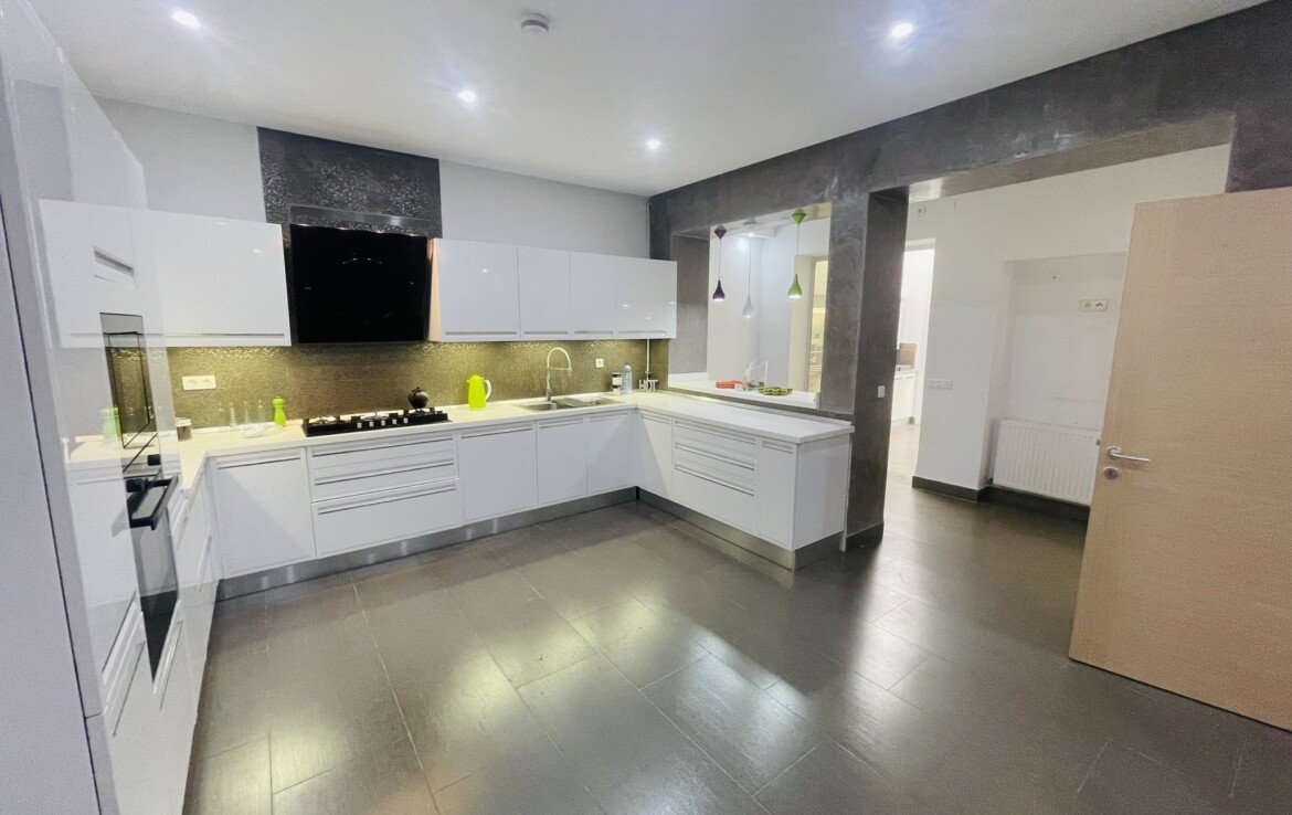 => RDC : Hall d’entrée, Grand Salon avec cheminée à l’éthanol et Salle à manger (ou Séjour) qui donnent sur un jardin d’environ 90 m2, Sde invités, Grande Cuisine équipée, Cuisine de préparation, Suite de service avec Sde.