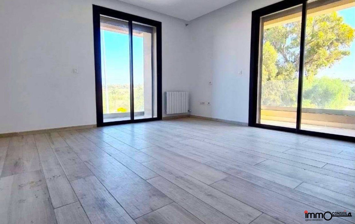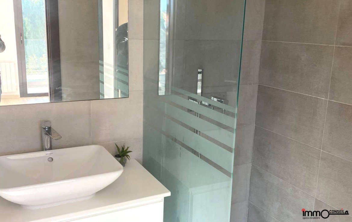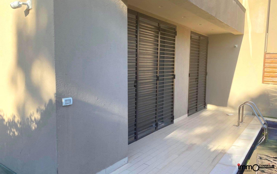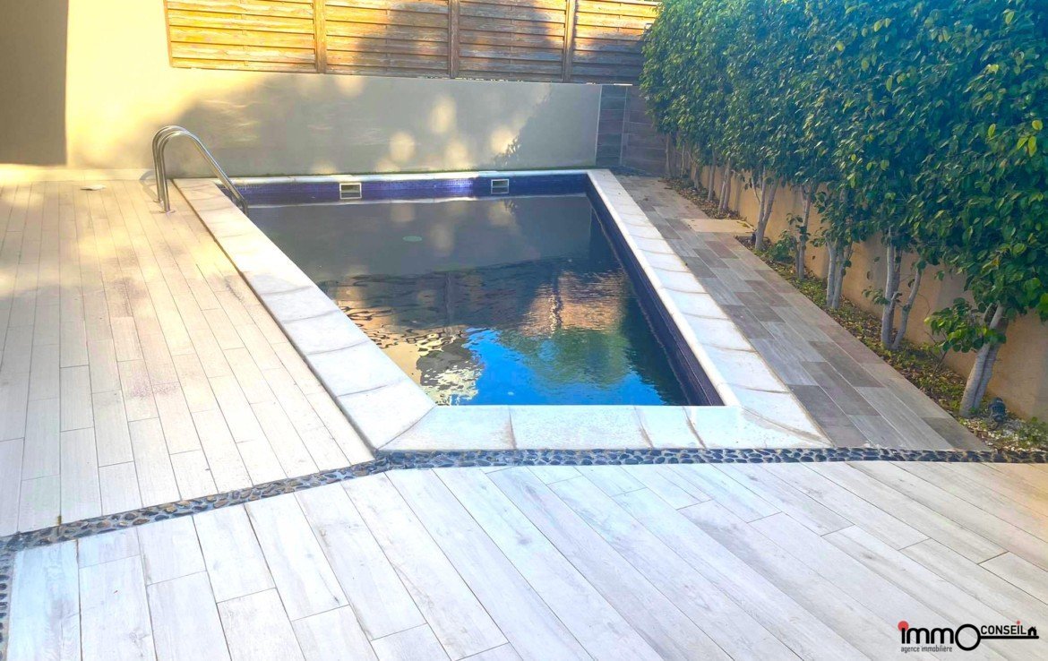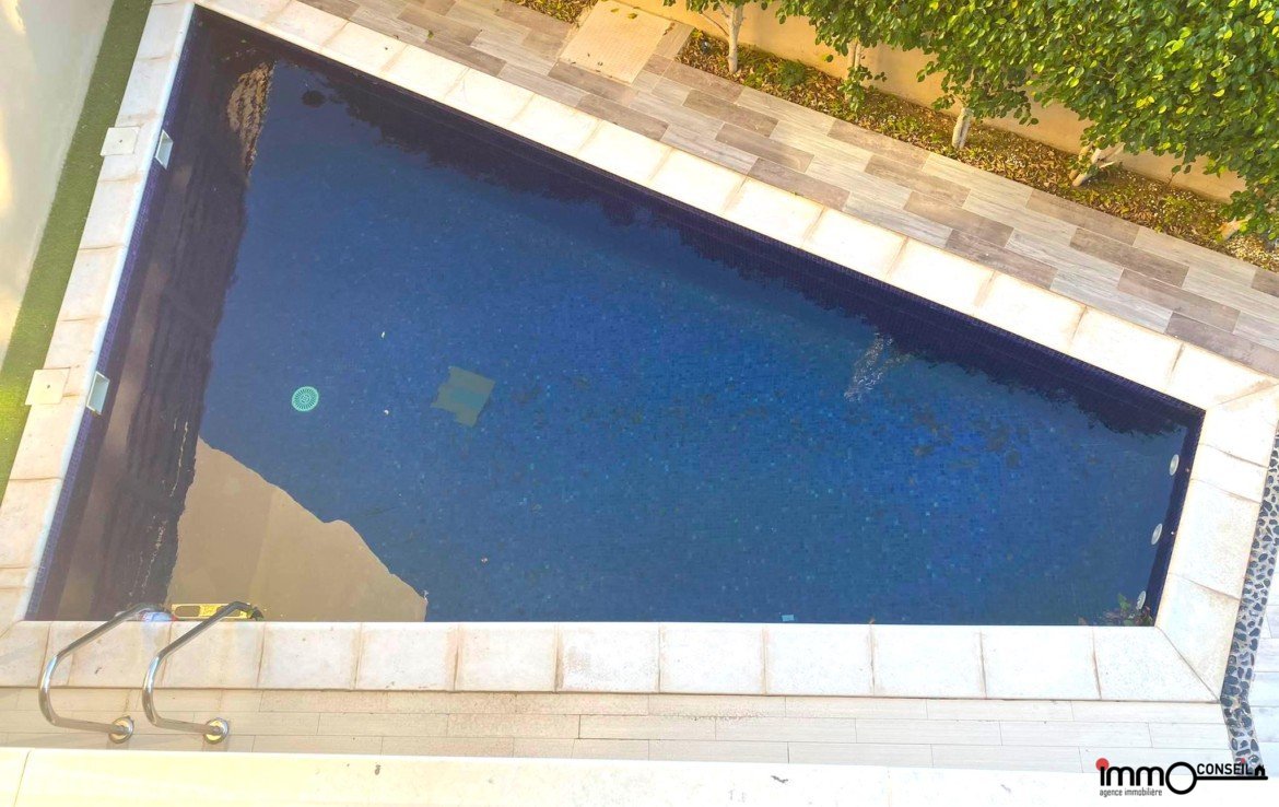 RDC : Grand Salon – Salle à manger qui donne sur la Piscine (chauffée), Chambre invités, Cuisine équipée et Sde.