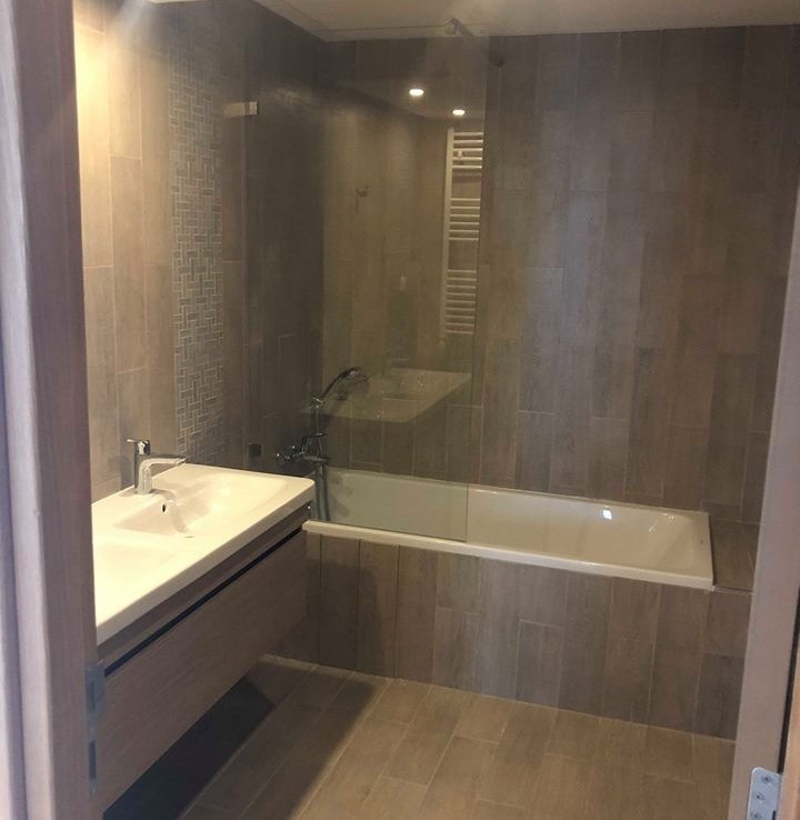 Salons revêtus de Marbre Botticino, Grès dans les Chambres, Faïences et Grès pour les Sdb.