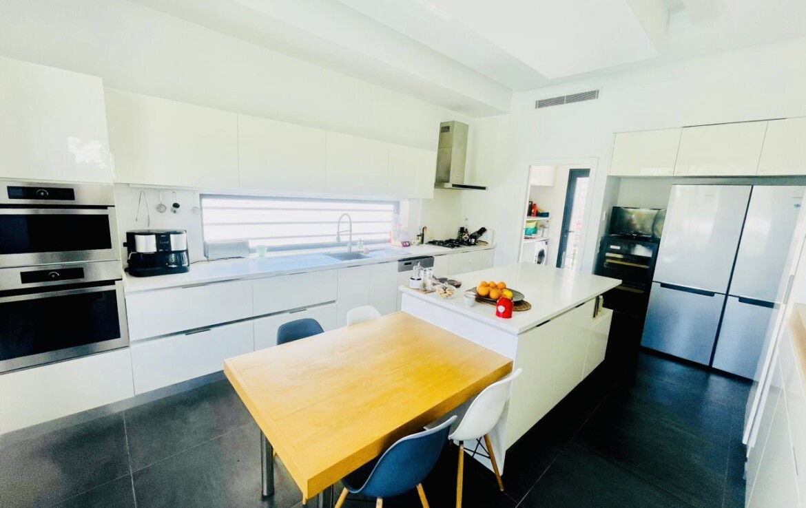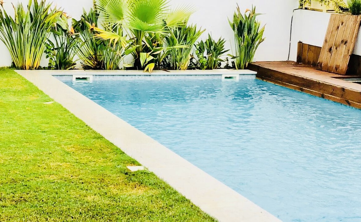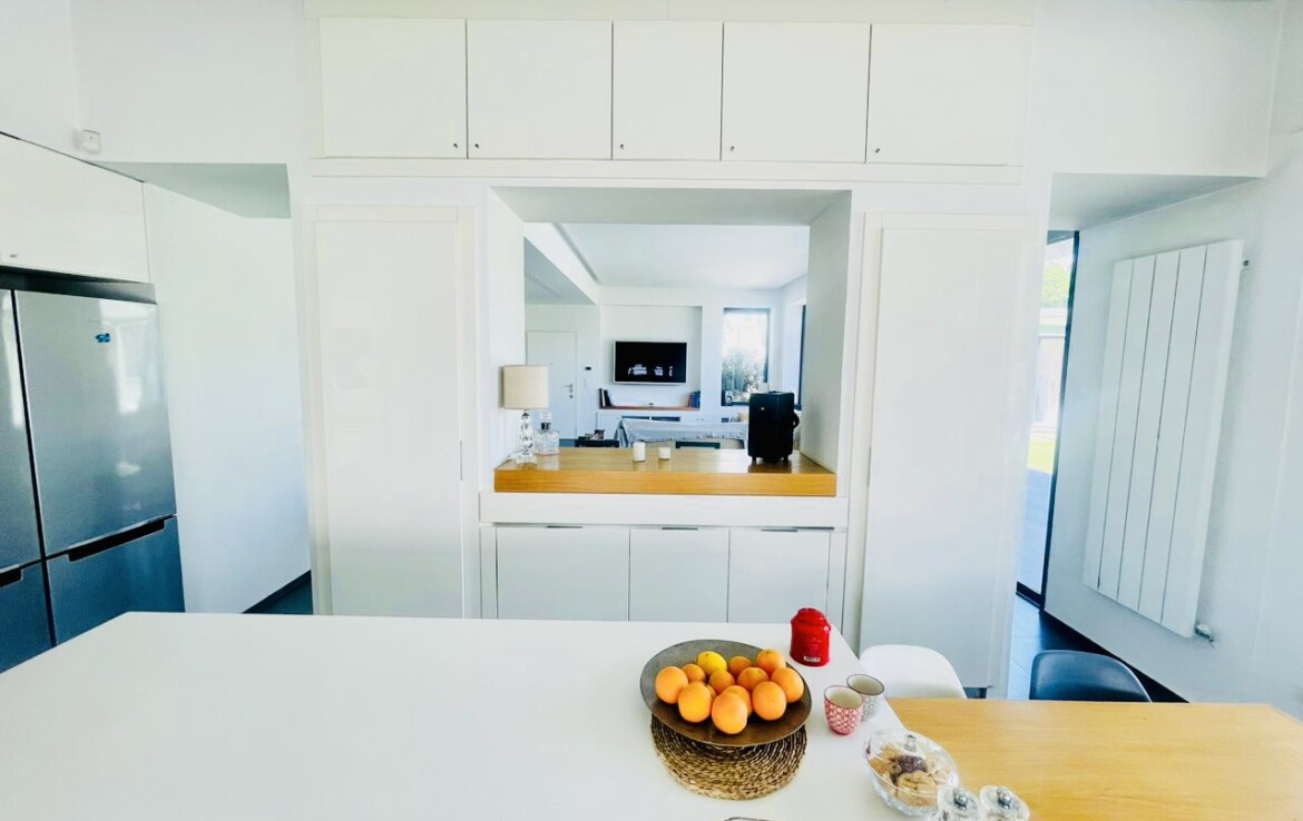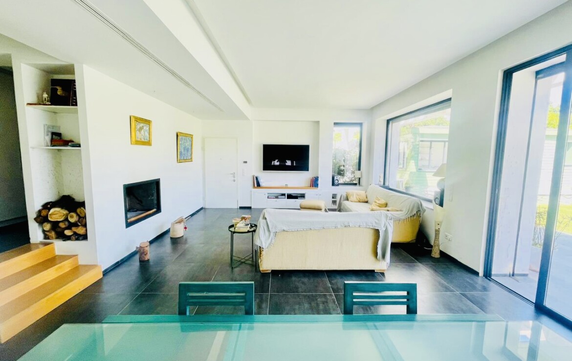 Grand Salon avec cheminée et baies vitrées sur un grand Jardin avec Piscine, Suite Parentale, 2 Chambres à coucher avec Sde commune, Cuisine équipée avec séchoir.